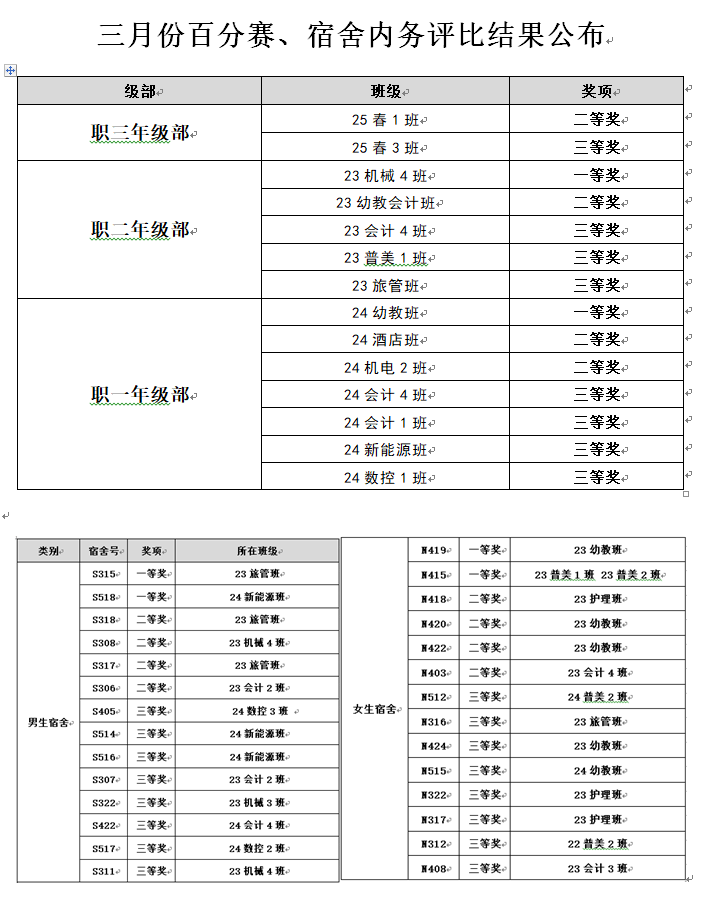 三月份百分赛、宿舍内务评比结果公布-尊龙凯时最新