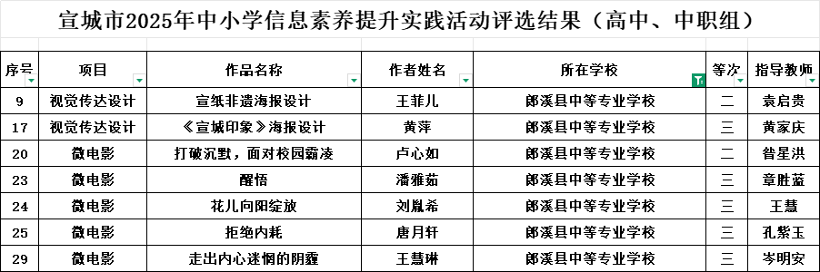 5月22日,宣城市教体局网站发布2025年宣城市中小学信息素养提升实践活动评选结果,郎溪县中等专业学校报送的7件学生作品获奖,其中二等奖2件,三等奖5件。