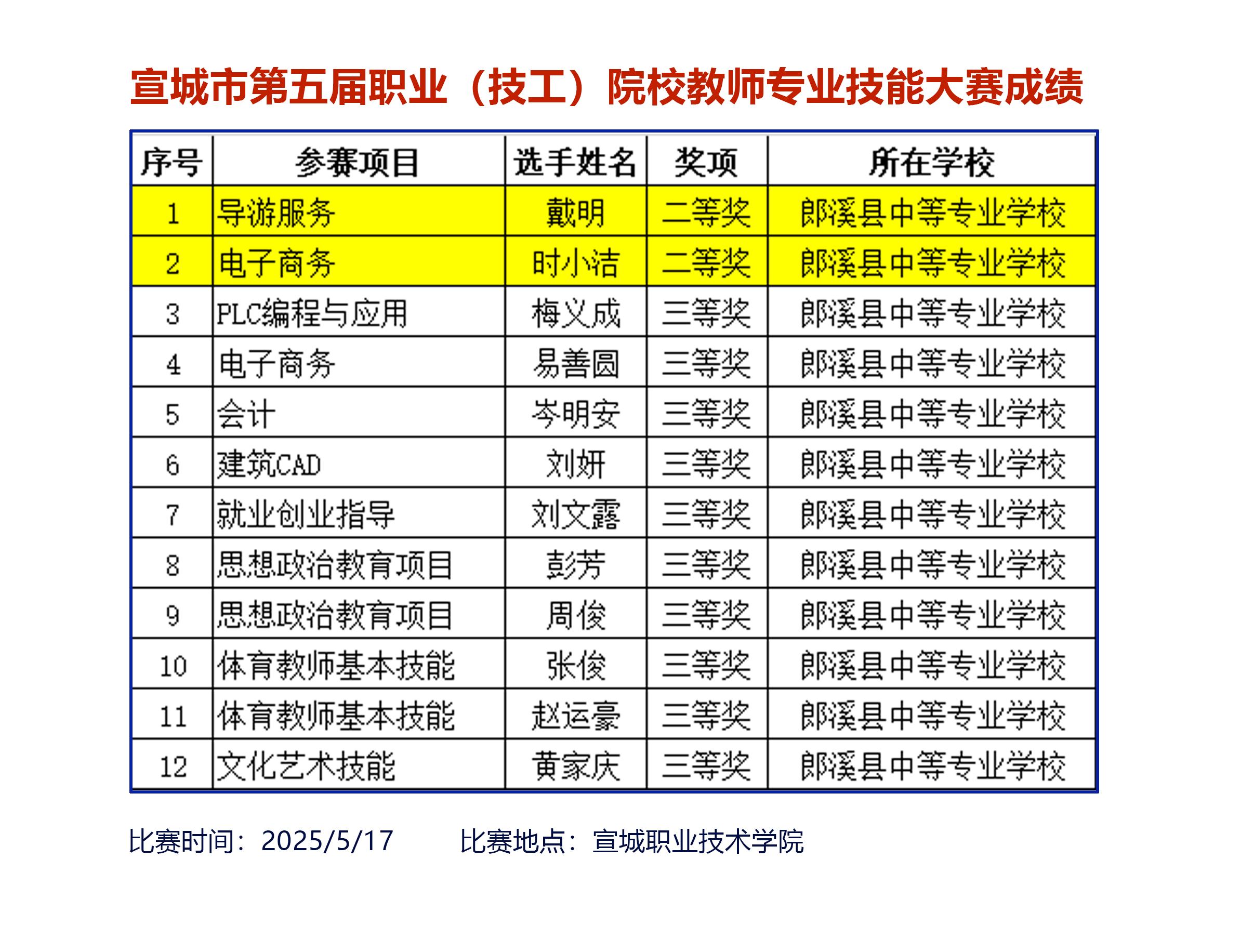 2025年5月17日在宣城职业技术学院举办了宣城市第五届职业(技工)院校教师专业技能大赛,22日市教体局尊龙凯时最新官网公布比赛结果,郎溪县中等专业学校获二等奖2个,三等奖10个。