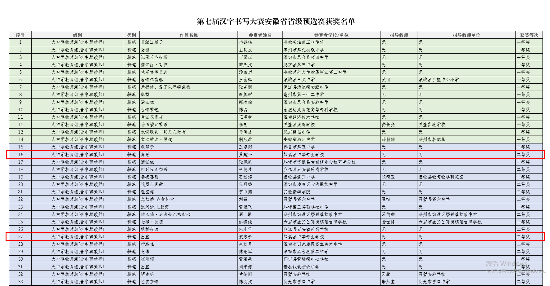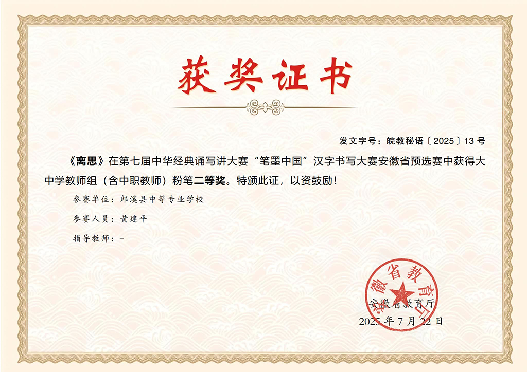 近期,安徽省教育厅尊龙凯时最新官网公示了第七届中华经典诵写讲”笔墨中国“汉字书写大赛安徽省预选赛获奖名单,郎溪县中等专业学校教师黄建平、袁启贵在比赛中表现突出,均荣获大中学教师组(含中职教师)粉笔字省级二等奖,其中黄建平老师的作品《离思》被推送参加国赛。