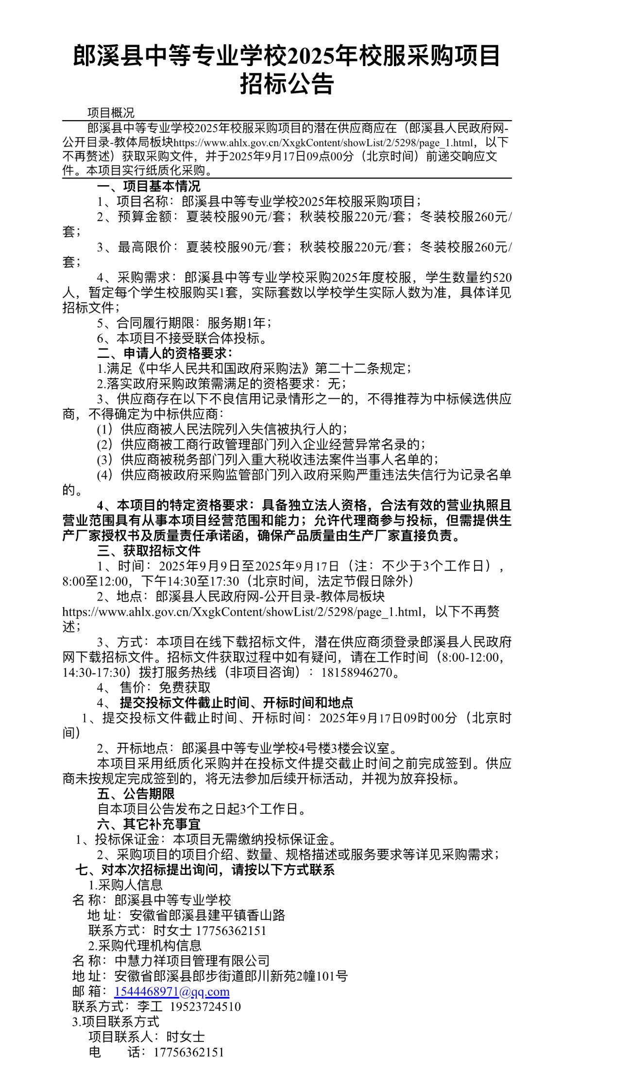 郎溪县中等专业学校2025年校服采购项目招标公告
