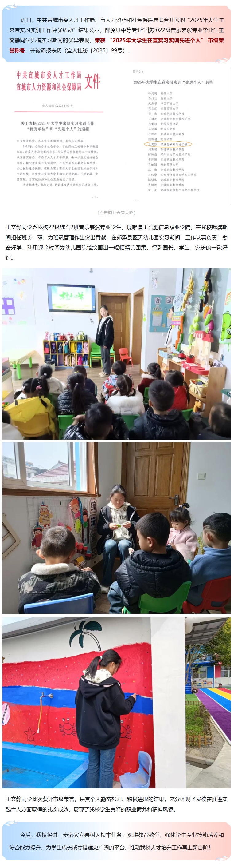 我校优秀毕业生获“2025年大学生来宣实习实训先进个人”市级表彰