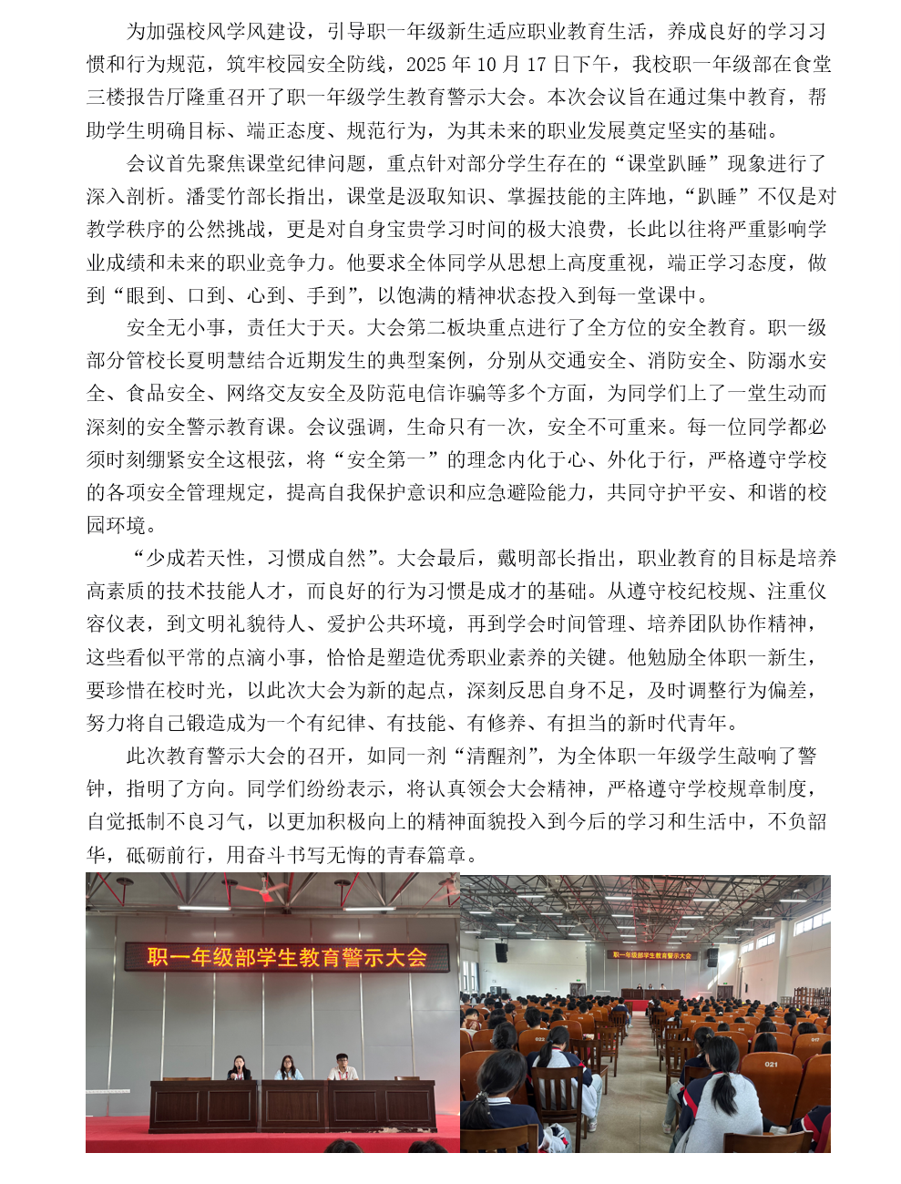 警钟长鸣,规范前行——我校成功召开职一年级学生教育警示大会