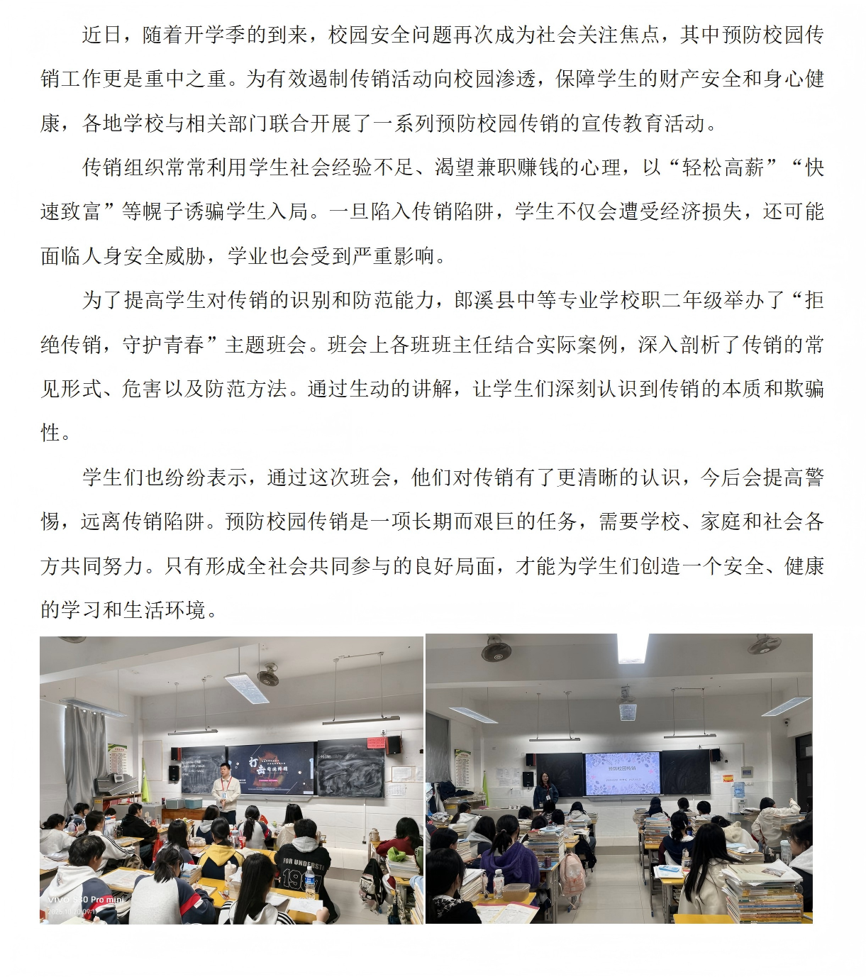 职二年级组织防传销主题班会