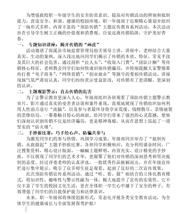 筑牢思想防线,远离传销陷阱——我校职一年级部成功举办预防传销主题宣传活动