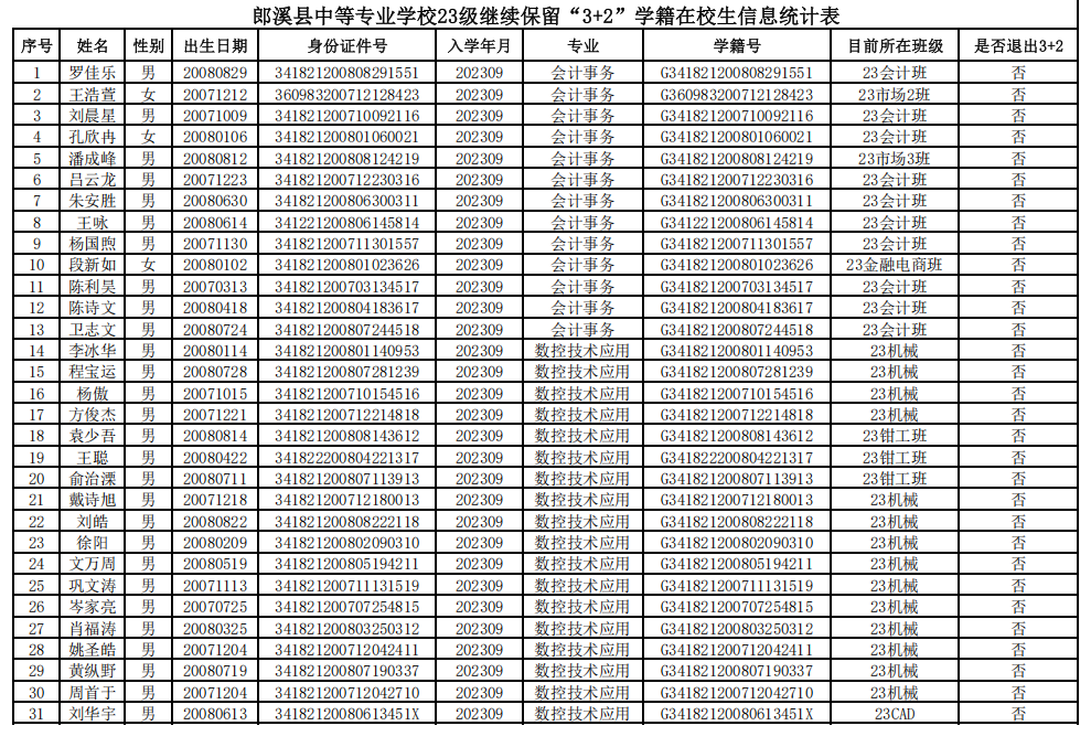 郎溪县中等专业学校23级继续保留“3 2”学籍在校生信息统计表