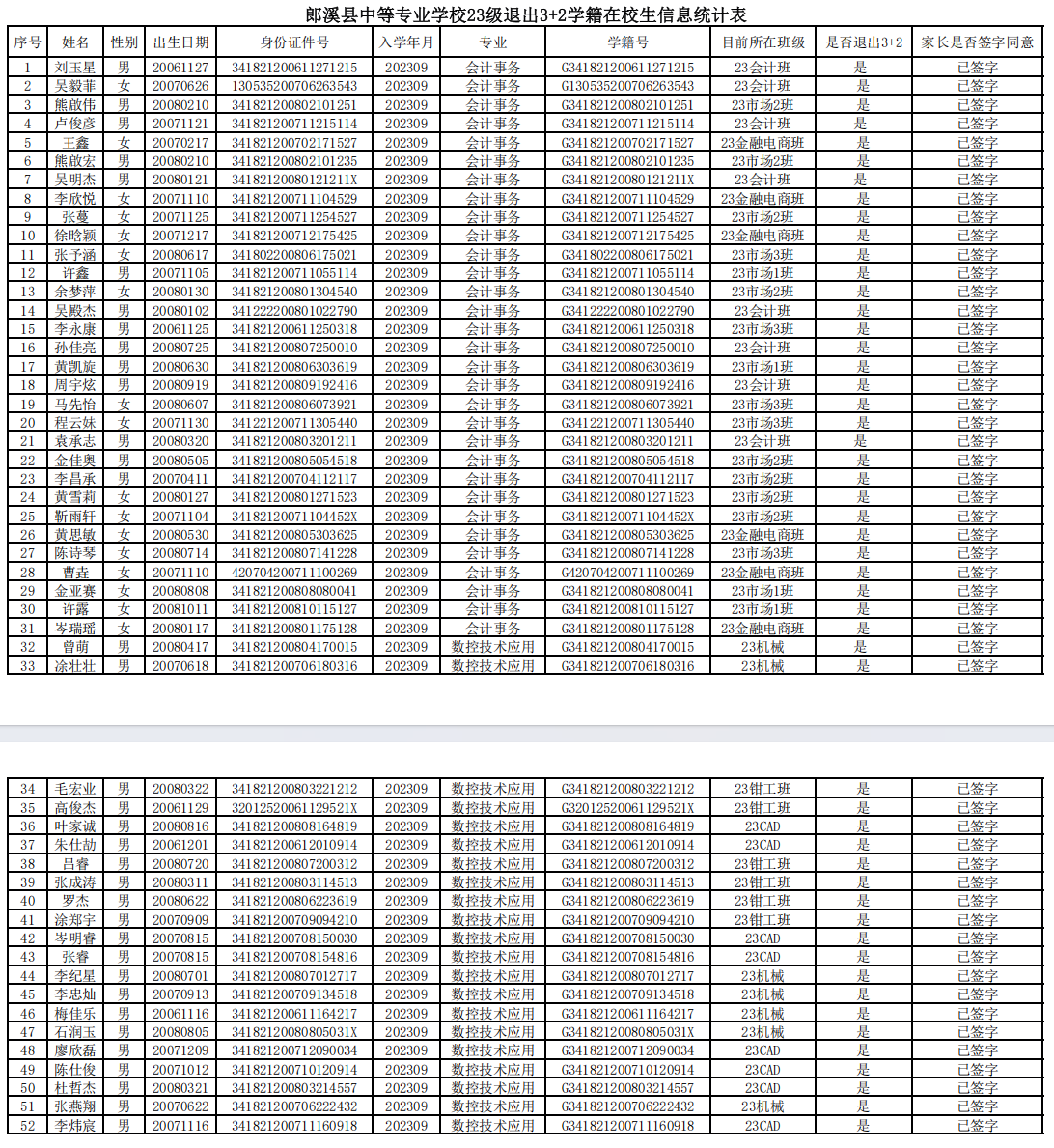 郎溪县中等专业学校23级退出“3 2”学籍在校生信息统计表